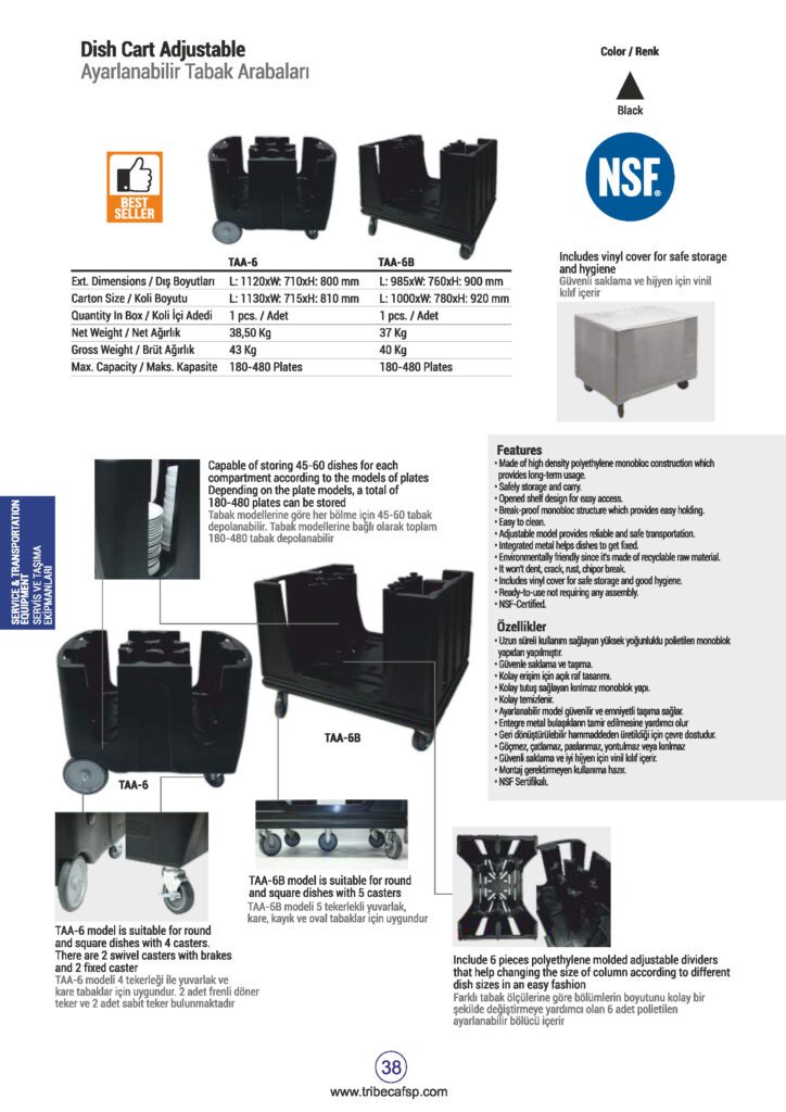 | · Made of low density polyethylene. Monobloc construction for long-term usage. · Includes 6 pcs polyethylene molded adjustable dividers that help change the size of the column based on the size of the dish. · Safe storage and carriage. · High movement capability thanks to heavy duty wheels and swivel brakes. · Stores 45 to 60 dishes for each shelf. · Break-proof monobloc construction that provides easy holding. Easy cleaning · Adjustable model provides reliable and safe transportation. Integrated metal parts that help plates be in a fixed position. · It won’t dent, crack, rust, chip or break. |